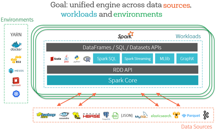 또한, 아파치 스파크는 다양한 데이터 소스, 개발환경, 작업등을 통합 분석 할 수 있는 엔진으로 개발되고 발전하고 있으며, 최근에는 딥러닝(Deeplearning)과 파이썬(Python)의 Pandas패키지등 인공지능과 데이터분석에도 적극적으로 지원하고 있다.