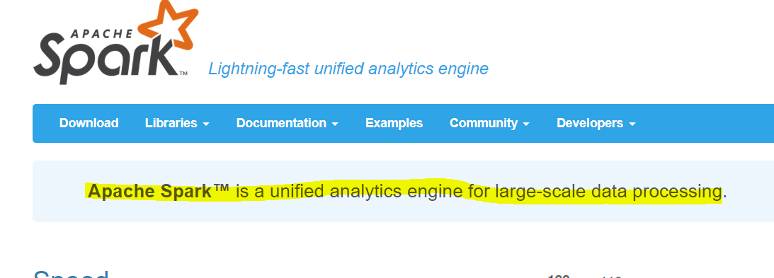 아파치 스파크(Apache Spark)는 아래 공식 홈페이지에 소개된 것처럼 대용량 데이터를 처리하기 위한 통합 분산 엔진이다.
