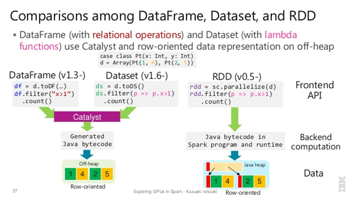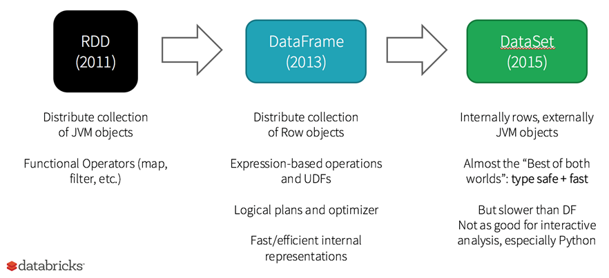스파크 1.x대 에서는 RDD를 직접 개발하는 과정이 주로 였지만, 2.x로 업그레이드 되고나서는 우리가 익숙한 엑셀/ R / Python의 DataFrame과 같은 DataFrame이라는 구조적 데이터 형태를 사용하게 된다.