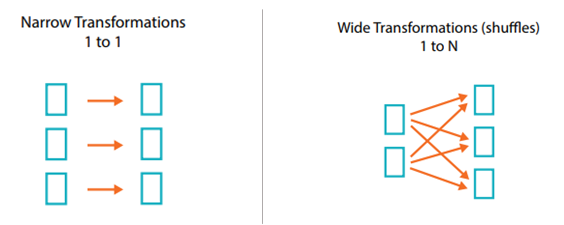 추가로 Transformation 연산은 Narrow Transformations(좁은 트랜스포메이션), Wide Transformations(넓은 프랜스포메이션) 이 있는데 Transformation 연산 수행 시, 하나의 연산이 수행될 데이터가 하나의 노드에 바로 있어서 수행되는 것이 Narrow Transformation이고, Wide Transformation은 연산처리되어야 할 데이터 클러스터 노드 여기저기에 분산되어 있어서 연산처리 수행 시, 메모리 간의 전달량이 많아 지는 것을 말한다. 즉, 네트워크 연산 처리량이 많아진다.
