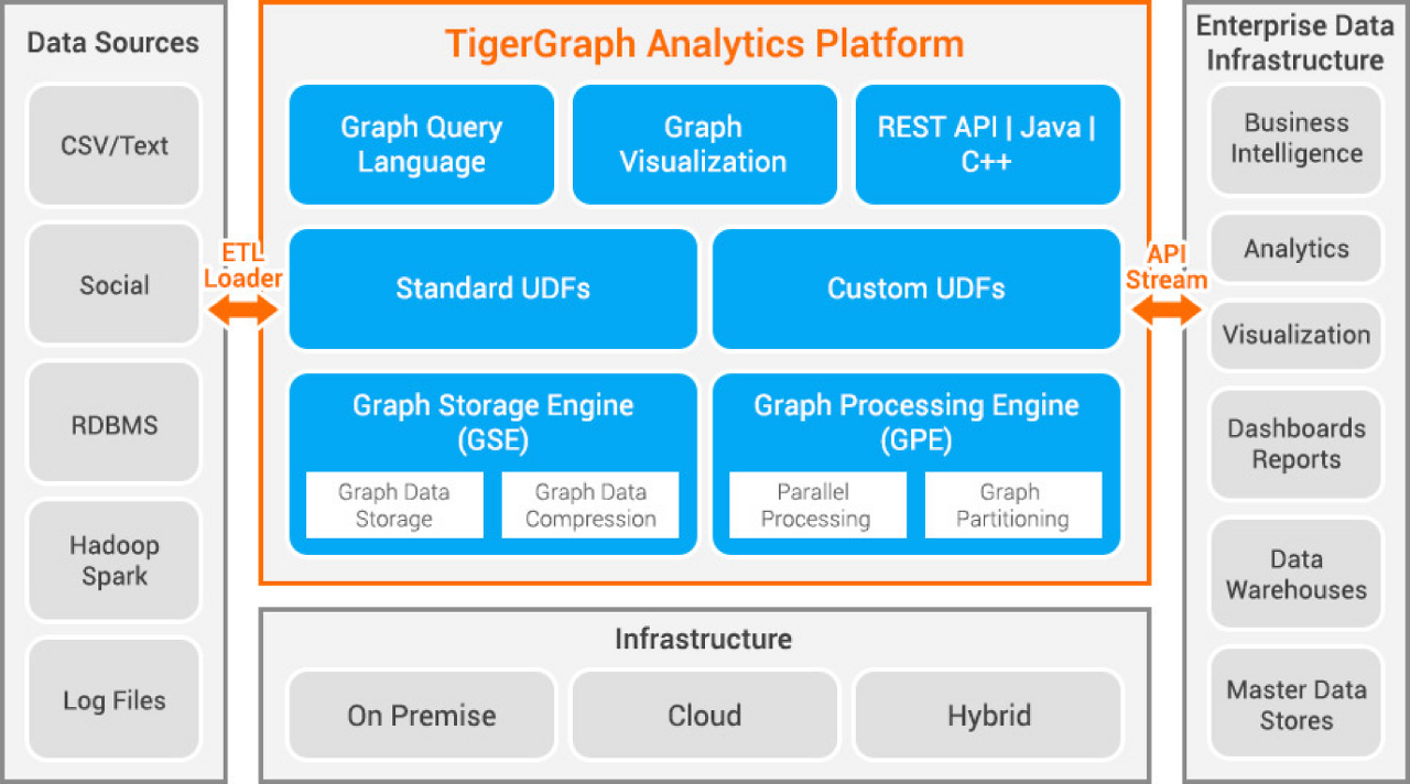 - 표준 및 사용자 정의 UDF는 응용 프로그램 논리를 인코딩하는 C++ 함수. 이러한 UDF는 상위 레이어와 하위 레이어 사이의 다리 역할을 수행. UDF는 엔진 컴파일 시간에 링크되는 정적 라이브러리 형식으로 상주할 수 있음. 또는 엔진 런타임에 연결 가능한 동적 링크 라이브러리일 수 있음. 많은 표준 그래프 작업과 일반 그래프 알고리즘은 사전 구축된 정적 라이브러리에 코딩되어 있으며 각 시스템 릴리스에서 엔진과 연결. 임시 사용자 쿼리는 GSQL 컴파일 시간에 생성되고 런타임에 엔진에 연결